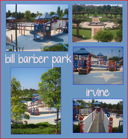 We love Bill Barber Park in Irvine! The park has a huge tot lot with equipment for all ages. There are bridges so kids can get onto the equipment from the upper level and vice versa. It also has a great climbing area, and distinct separate play equipment for toddlers and big kids. My daughter also loves the “froggie fountain,” which is a beautiful fountain in the center of a trellis lined courtyard area. The first time we went there we were a little confused on where to park. Off of Harvard, you will turn into the parking lot at the light “San Juan.” There is usually plenty of parking. Click this link for directions. There are 4 nice covered picnic areas, the restroom is close-by, and as luck would have it for me this weekend, a concession was open for the soccer games when I was in dire need of a Diet Coke fix! Only downfall is that other than the covered picnic areas, there is not a lot of shade, so wear your hats and SPF in the summer months as it can get a bit toasty.