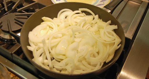 Cut the onions into little rainbow-shaped slivers. Meanwhile, heat a decent amount (around 2 – 3 TBSP) of olive oil on medium high in a skillet. Let it get nice and hot then add in your onions.