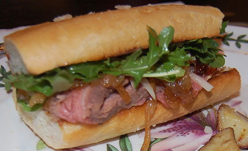 After it is cut, get your toasty bread and pile on the steak, Dijon sauce, arugula, carmelized onions and shaved parmesan for ONE AMAZING sandwich!